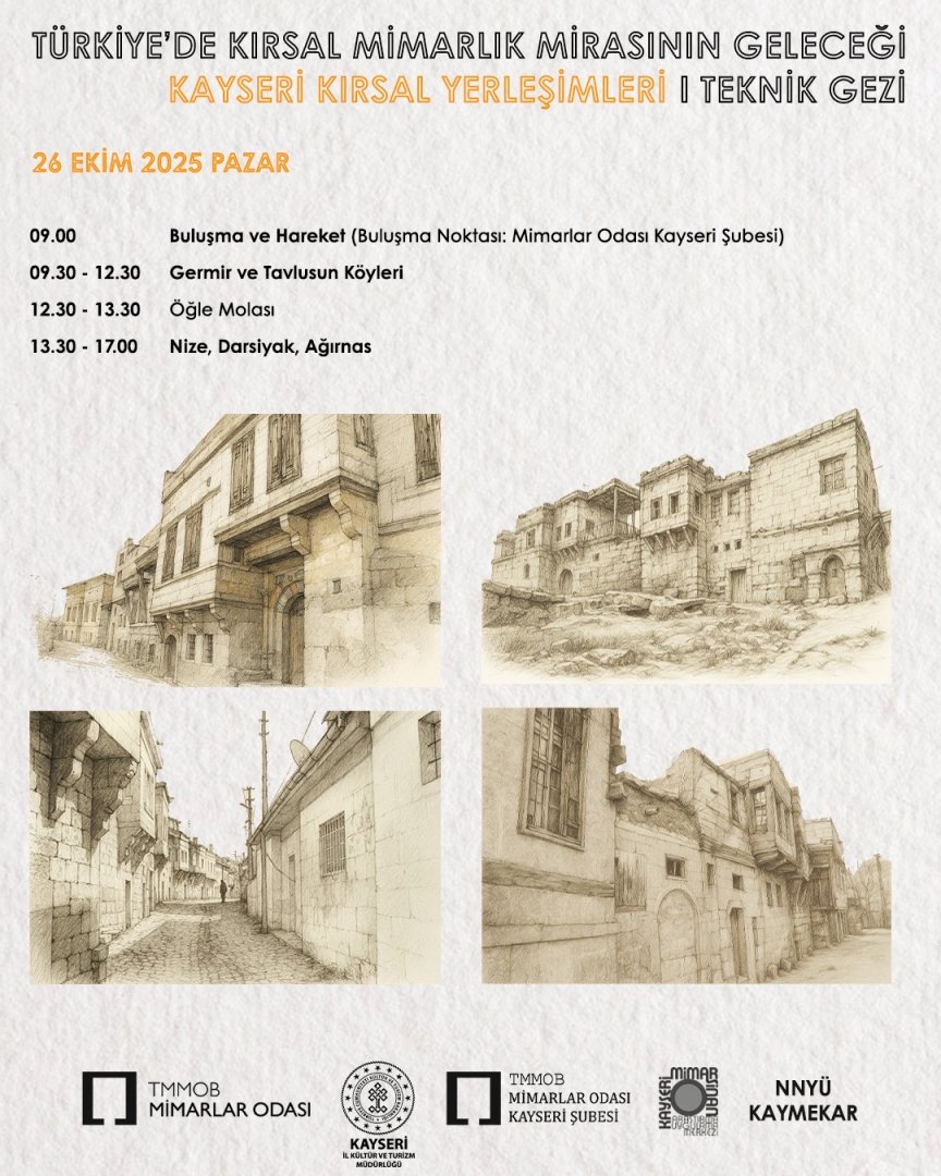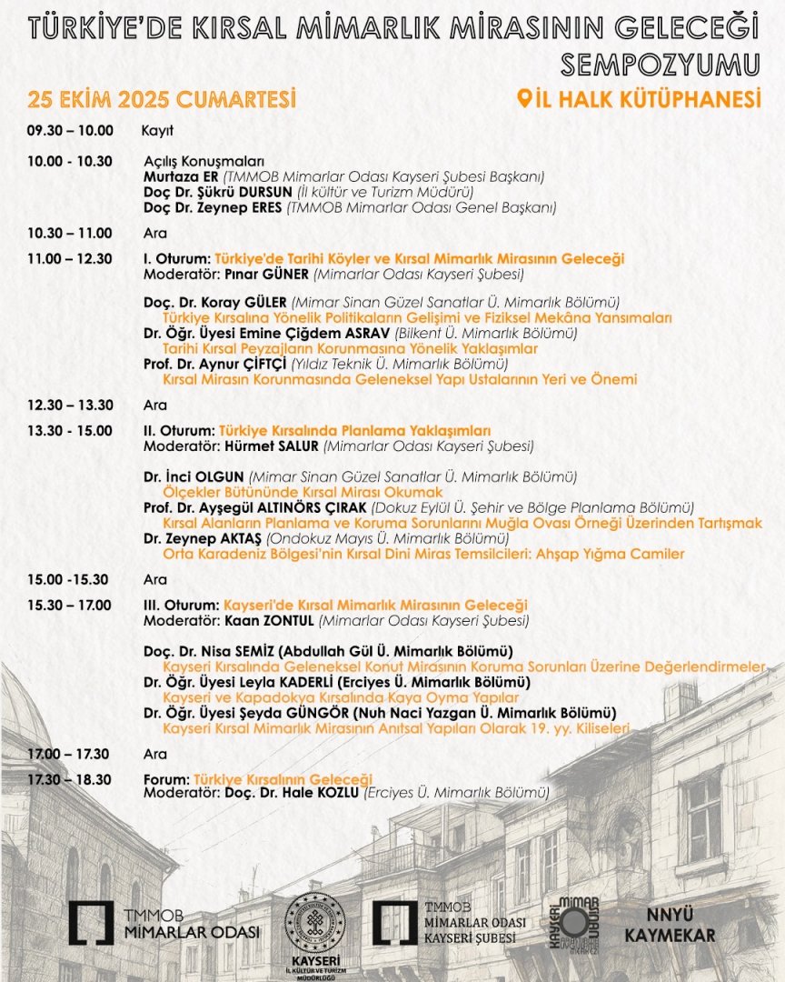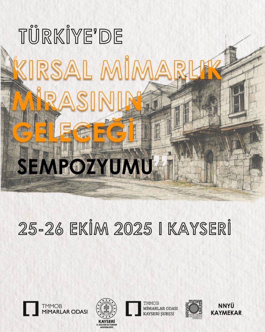 TMMOB Mimarlar Odası Genel Merkez Kültürel Mirasın Korunması ve Geliştirilmesi Komitesi tarafından, Mimarlar Odası Kayseri Şubesi ev sahipliğinde ve Kayseri Valiliği İl Kültür ve Turizm Müdürlüğü, Erciyes Üniversitesi Mimar Sinan Mimarlık ve Kültür Uygulama ve Araştırma Merkezi, NNYÜ Kentsel Mekan Uygulama ve Araştırma Merkezi iş birliğiyle düzenlenen “Türkiye’de Kırsal Mimarlık Mirasının Geleceği” başlıklı sempozyum, 25–26 Ekim 2025 tarihlerinde Kayseri’de gerçekleştirilecektir.